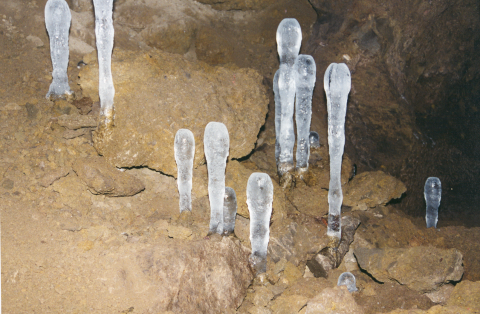 Diese sind nicht etwa Überreste aus der Eiszeit, die vor etwa 10.000 Jahren durch das Abtauen des großen Skandinavischen Inlandseisgebietes ihren Abschluss fand, sondern die Folge eines interessanten geologischen Vorgangs. Ist der von Luft erfüllte Teil der Gesteine, die hier die Erdrinde bilden, mit Wasser gefüllt und sind dort Hohlräume vorhanden, so bilden sich an der Decke solcher Hohlräume Wassertropfen. Aufgrund der kalten Temperaturen in den Höhlen und einem fehlenden Austausch durch warme Luft im Winter entstehen dann im Laufe der Zeit Eiszapfen. Die Formenvielfalt und Schönheit dieser Eiszapfen hat die Relikte des ehemaligen Mühlsteinabbaus überregional als "Eishöhlen" bekannt gemacht. Diese wurden teilweise auch von Menschen in früheren Jahrhunderten als "Kühlschränke" genutzt.